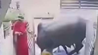 सड़क से घर तक पहुंची सांड़ों की जंग, गेट पर खड़ी महिलाओं को छूकर निकल गए