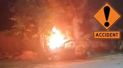 सड़क हादसे बाद कार में लगी भीषण आग, मचा हड़कप