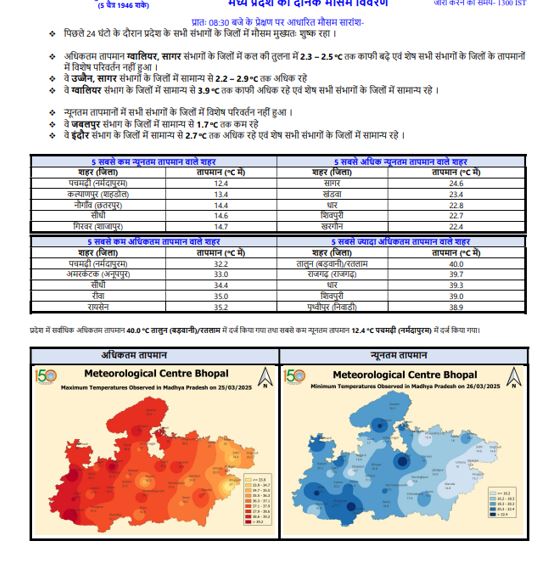 - नर्मदापुरम में अधिकतम तापमान 40.9 डिग्री सेल्सियस, रतलाम में 40.2 डिग्री सेल्सियस, नौगांव (छतरपुर), शिवपुरी, गुना और दमोह में: 40 डिग्री सेल्सियस रहा.