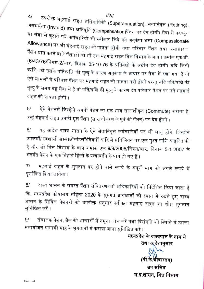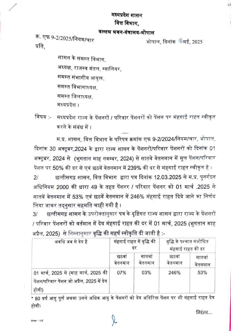 भोपाल: मध्य प्रदेश राज्य सरकार द्वारा राज्य कर्मचारियों को बड़ी राहत देने जा रही है। अब पेंशनर्स को 3% महंगाई भत्ता मिलेगा। सरकार ने नोटिस और आदेश जारी कर दिए हैं। 2024 के मानक के अनुसार महंगाई भत्ता 50% की दर से दिया जाता था, लेकिन अब डीआर को 50% से बढ़ाकर 55% कर दिया गया है, जिसके तहत 5% अतिरिक्त राहत भत्ता दिया जाएगा। वित्त विभाग जारी आदेश के तहत जल्द ही पेंशनर परिवारों को महंगाई राहत मिलने की उम्मीद है। मिली जानकारी के अनुसार, सरकार उन कर्मचारियों को एरियर राशि एकमुश्त देगी जो 1 जुलाई 2024 के बाद सेवानिवृत्त हुए हैं या उनकी मृत्यु हो गई है।