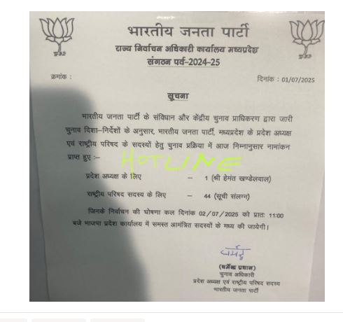 भोपाल । मध्य प्रदेश भाजपा के प्रदेश अध्यक्ष को लेकर तस्वीर साफ हो गई है। प्रदेश अध्यक्ष पद के लिए सिर्फ हेमंत खंडेलवाल ने ही नामांकन किया है, उनके अलावा किसी अन्य सदस्य ने दावेदारी पेश नहीं की है। ऐसे में हेमंत खंडेलवाल का निर्विरोध प्रदेश अध्यक्ष बनना तय माना जा रहा है। पार्टी सूत्रों का कहना है कि बुधवार को प्रदेश कार्यकारिणी की बैठक में उनके नाम का औपचारिक एलान किया जाएगा। नामांकन के दौरान सीएम डॉ मोहन यादव, वीडी शर्मा, केंद्रीय मंत्री शिवराज सिंह चौहान, केंद्रीय मंत्री ज्योतिरादित्य सिंधिया, केंद्रीय मंत्री वीरेंद्र खटीक, प्रदेश बीजेपी अध्यक्ष वीडी शर्मा, मंत्री प्रह्लाद पटेल, डिप्टी सीएम राजेंद्र शुक्ल, डिप्टी सीएम जगदीश देवड़ा और मंत्री राकेश सिंह समेत कई नेता प्रस्तावक के रूप में उनके साथ मौजूद रहे। खंडेलवाल मूल रूप से उत्तर प्रदेश के मथुरा के रहने वाले हैं। उनका जन्म 3 सितंबर 1964 को मथुरा में हुआ था। खंडेलवाल को राजनीति और समाजसेवा के संस्कार अपने पिता स्वर्गीय विजय कुमार खंडेलवाल से विरासत में मिले हैं। विजय कुमार खंडेलवाल भाजपा से सांसद रह चुके हैं। पिता के निधन के बाद हेमंत खंडेलवाल ने उनकी राजनीतिक और समाजिक विरासत संभाली। हेमंत अपने पिता के समय से ही जनसेवा के लिए समर्पित रहे हैं।