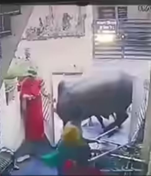 सड़क से घर तक पहुंची सांड़ों की जंग, गेट पर खड़ी महिलाओं को छूकर निकल गए