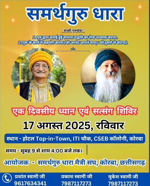 समर्थगुरू धारा मैत्री संघ द्वारा 17 अगस्त को कोरबा में ध्यान एवं सत्संग शिविर आयोजित