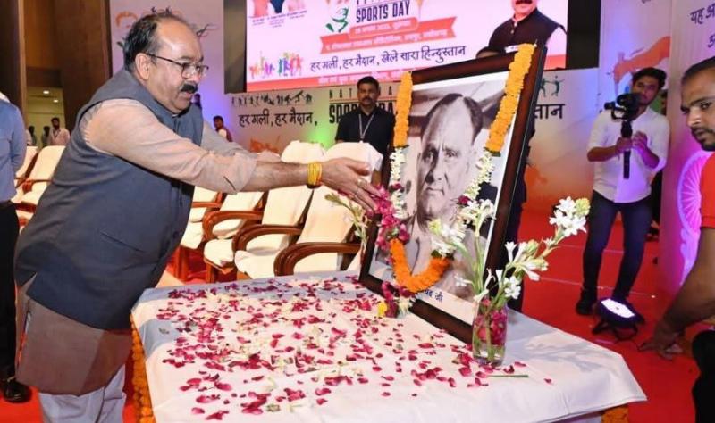 रायपुर : उप मुख्यमंत्री तथा खेलकूद एवं युवा कल्याण मंत्री अरुण साव आज राजधानी रायपुर के पंडित दीनदयाल उपाध्याय ऑडिटोरियम में राष्ट्रीय खेल दिवस के आयोजन में शामिल हुए। ‘हॉकी के जादूगर’ के नाम से मशहूर मेजर ध्यानचंद की जयंती पर पूरे देश में आज राष्ट्रीय खेल दिवस मनाया जा रहा है। कार्यक्रम में उनकी तस्वीर पर माल्यार्पण कर उनका पुण्य स्मरण किया गया। राष्ट्रीय खेल दिवस पर विविध आयोजनों के बीच उप मुख्यमंत्री अरुण साव के आह्वान पर खिलाड़ियों ने ‘हर गली हर मैदान, खेले सारा हिंदुस्तान’ के जोरदार नारे से पंडित दीनदयाल उपाध्याय ऑडिटोरियम को गूंजा दिया।
