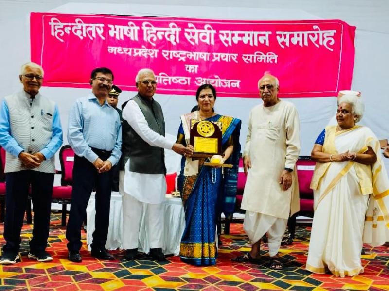 भोपाल, 4 अक्टूबर 2025, शनिवार राज्यपाल श्री मंगुभाई पटेल ने कहा कि “भाषा केवल संप्रेषण का माध्यम नहीं, बल्कि एक संपूर्ण संस्कृति है, जो व्यक्ति को सरल, सहृदय और संवेदनशील बनाती है।” वे मध्यप्रदेश राष्ट्रभाषा प्रचार समिति द्वारा हिन्दी भवन, भोपाल में आयोजित हिन्दीतर भाषी हिन्दी सेवी सम्मान समारोह को संबोधित कर रहे थे। राज्यपाल ने विभिन्न श्रेणियों में लेखकों, प्रशासनिक अधिकारियों, हिन्दी सेवा साधकों और युवा साहित्यकारों को समिति द्वारा स्थापित पुरस्कारों से सम्मानित किया। इसी क्रम में हिन्दी लेखिका संघ की प्रांताध्यक्ष डॉ. साधना गंगराड़े को भी हिन्दी सेवी पुरस्कार से सम्मानित किया गया। उन्हें राज्यपाल श्री पटेल ने शॉल, श्रीफल और प्रशस्ति पत्र प्रदान कर सम्मानित किया। कार्यक्रम में समिति के उपाध्यक्ष द्वय श्री रघुनंदन शर्मा एवं डॉ. रंजना अरगड़े, राज्य निर्वाचन आयुक्त डॉ. मनोज श्रीवास्तव, वरिष्ठ साहित्यकार डॉ. महेश सक्सेना, तथा सप्रे संग्रहालय के संचालक श्री विजय दत्त श्रीधर सहित अनेक राष्ट्रभाषा प्रेमी और गणमान्य नागरिक उपस्थित थे। राज्यपाल ने अपने उद्बोधन में कहा कि प्रधानमंत्री श्री नरेन्द्र मोदी के नेतृत्व में हिन्दी की लोकप्रियता विश्व भर में बढ़ी है। “जब मोदी जी अंतरराष्ट्रीय मंचों पर हिन्दी में बोलते हैं, तो पूरा विश्व ध्यानपूर्वक सुनता है,” उन्होंने कहा।उन्होंने कहा कि हिन्दी और क्षेत्रीय भाषाओं में समन्वय से भारतीय भाषाओं का वैश्विक सम्मान और बढ़ेगा। राज्यपाल ने हिन्दी सेवियों से अनुरोध किया कि वे हिन्दी के प्रसार से जुड़ी भ्रामक शंकाओं को दूर करने के लिए संवाद सेतु बनें।