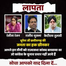 रायपुर । बीजेपी ने कांग्रेस राज्य सभा सांसदों को लेकर कसा तंज, लापता वाला पोस्टर किया जारी बीजेपी ने x पर पोस्ट कर लिखा । छत्तीसगढ़ियों का हक मारने वाले कांग्रेसियों के सांसद हैं।लापता जनता के साथ-साथ कांग्रेस के कार्यकर्ता भी इन्हें ढूंढ रहे किसी को मिले तो राजीव भवन, रायपुर में संपर्क करें। बीजेपी ने छत्तीसगढ़ में कांग्रेस के राज्यसभा सांसदों पर तंज कसते हुए एक पोस्टर जारी किया है, जिसमें उन्हें “लापता” बताया गया है। पार्टी ने अपने सोशल मीडिया प्लेटफॉर्म पर लिखा है कि “छत्तीसगढ़ियों का हक मारने वाले कांग्रेस के सांसद लापता हैं”। बीजेपी ने यह भी कहा है कि न केवल जनता, बल्कि कांग्रेस के कार्यकर्ता भी इन सांसदों को खोज रहे हैं। यदि किसी को उनके बारे में जानकारी मिले, तो वह राजीव भवन, रायपुर में संपर्क कर सकता है । इस पोस्टर के माध्यम से बीजेपी ने कांग्रेस पर निशाना साधा है, यह दर्शाते हुए कि पार्टी के सांसदों की अनुपस्थिति से जनता को नुकसान हो रहा है। यह कदम राजनीतिक रणनीति का हिस्सा माना जा रहा है, जिसमें बीजेपी अपने विरोधियों को कमजोर दिखाने की कोशिश कर रही है।