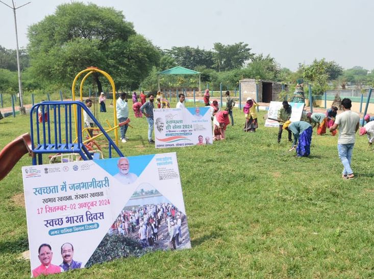 रिसाली। स्वच्छता ही सेवा अभियान के छटवें दिन नगर पालिक निगम रिसाली क्षेत्र के कल्याणी मंदिर तालाब के निकट स्थित उद्यान की सफाई की गई। क्षेत्रीय नागरिकों ने उद्यान में श्रमदान किया। आयुक्त मोनिका वर्मा के मार्गदर्शन में चल रहे स्वच्छता अभियान में नागरिक उद्यान में गंदगी नहीं फैलाने का संकल्प भी ले रहे है।