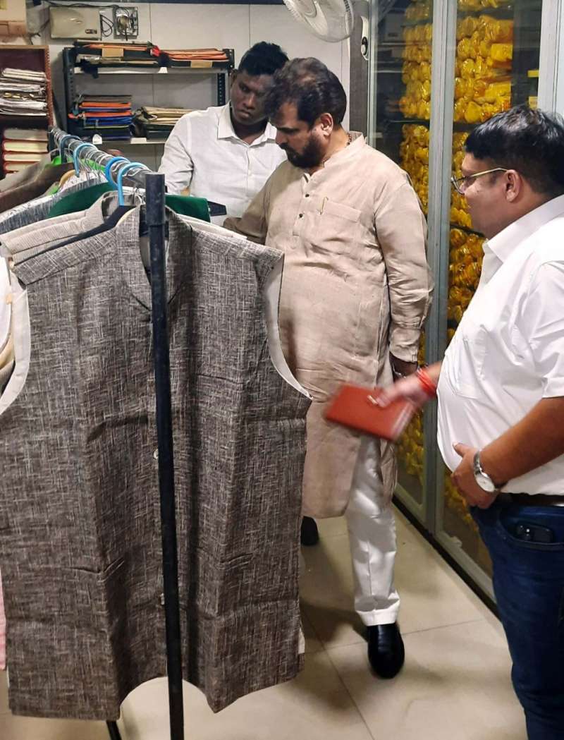 रायपुर : आत्मनिर्भर भारत के संकल्प को मजबूती देने के उद्देश्य से आज खादी तथा ग्रामोद्योग विभाग के नवनियुक्त अध्यक्ष राकेश पांडेय द्वारा रायपुर स्थित शास्त्री बाजार के खादी वस्त्र विक्रय भंडार एवं गांधी भवन स्थित खादी एम्पोरियम का निरीक्षण किया गया।