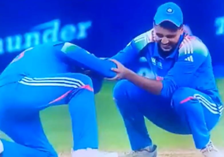 अक्षर पटेल ने कोहली का हाथ पकड़कर उन्हें ऐसा करने से रोका। दोनों के बीच इस दौरान जमकर हंसी-मजाक हुआ। कोहली को अक्षर पटेल ने पैर नहीं छूने दिए। दोनों भारतीय खिलाड़ी फिर खड़े हुए और कोहली ने कॉलर पकड़कर पटेल को पीछे की तरफ धक्का दिया।