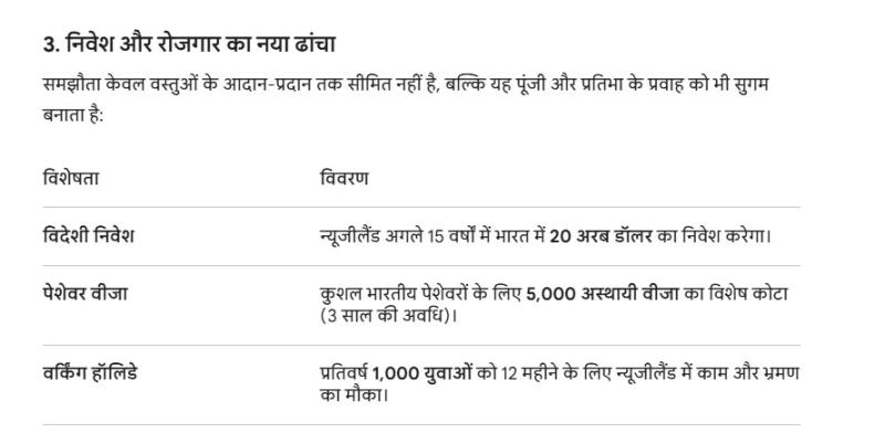 डेयरी सेक्टर: भारतीय डेयरी उद्योग की चिंताओं को देखते हुए दूध, पनीर, दही और क्रीम जैसे उत्पादों को एफटीए से बाहर रखा गया है। इससे न्यूजीलैंड के सस्ते डेयरी उत्पादों से भारतीय किसानों को खतरा नहीं होगा।